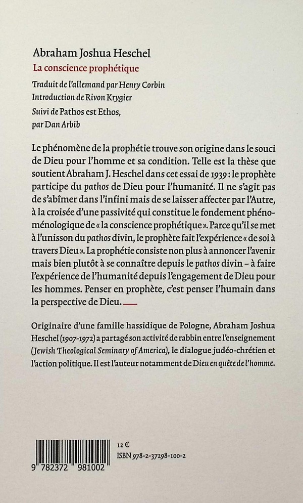 Le phénomène de la prophétie trouve son origine dans le souci de Dieu pour l'homme et sa condition. Telle est la thèse que soutient Abraham J. Heschel dans cet essai de 1939 : le prophète participe du pathos de Dieu pour l'humanité. Il ne s'agit pas de s'abîmer dans l'infini mais de se laisser affecter par l'Autre, à la croisée d'une passivité qui constitue le fondement phénoménologique de « la conscience prophétique ». Parce qu'il se met à l'unisson du pathos divin, le prophète fait l'expérience « de soi à travers Dieu ». La prophétie consiste non plus à annoncer l'avenir mais bien plutôt à se connaître depuis le pathos divin - à faire l'expérience de l'humanité depuis l'engagement de Dieu pour les hommes. Penser en prophète, c'est penser l'humain dans la perspective de Dieu.
